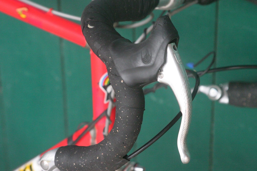 Es ist auch noch ein Rad mit Geschichte. Denn es hat mal Mike Kluge gehört. Da Mike Kluge viele Jahr für den RC Charlottenburg gefahren ist und der Radsponsor vom RC Charlottenburg viele Jahre Guerciotti war, mußte sein Rad natürlich von "Guerciotti" sein. Also nicht über den großen Guerciotti Aufkleber auf einem Cinelli Supercorsa Rahmen wundern, sonder sich über die schönen Laufräder mit Campagnolo Record Naben und Mavic GP4 Felgen mit handschriftlich aufgemalten Initialien M.K. freuen. Einziger Wermutstropfen waren die Dura Ace 7400 Bremsen mit entsprechenden Bremsgriffen und Dura Ace 7400 Schaltung. Die Bremsen sind ja top, aber die Griffe mußten weg. Also Campagnolo C-Record Bremsgriffe angebaut.